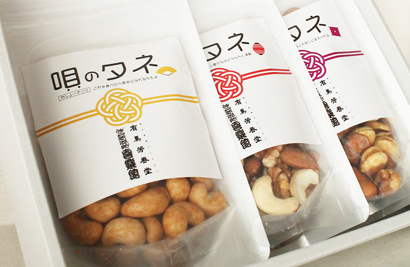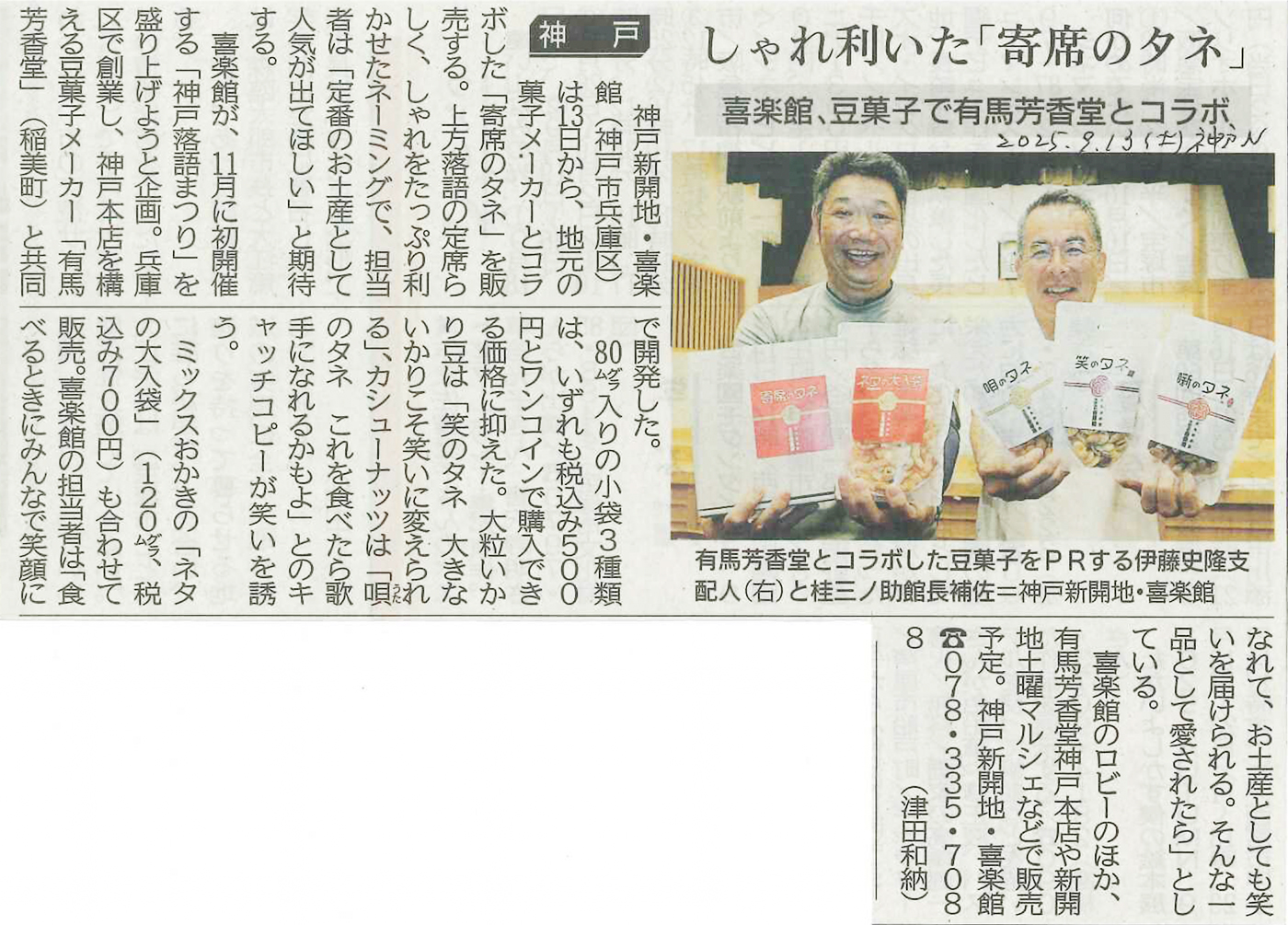 同じく兵庫区で創業、本店を置く豆菓子・ドライフルーツ専門店「有馬芳香堂」さんと共同で、寄席みやげを開発しました!!